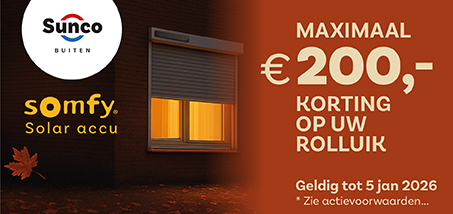 Maak je woning comfortabel, veilig én energiezuinig met de SuncoBuiten rolluiken! Profiteer nu van tot wel €200,- korting op Rolluiken Select of Premium Somfy Solar.
